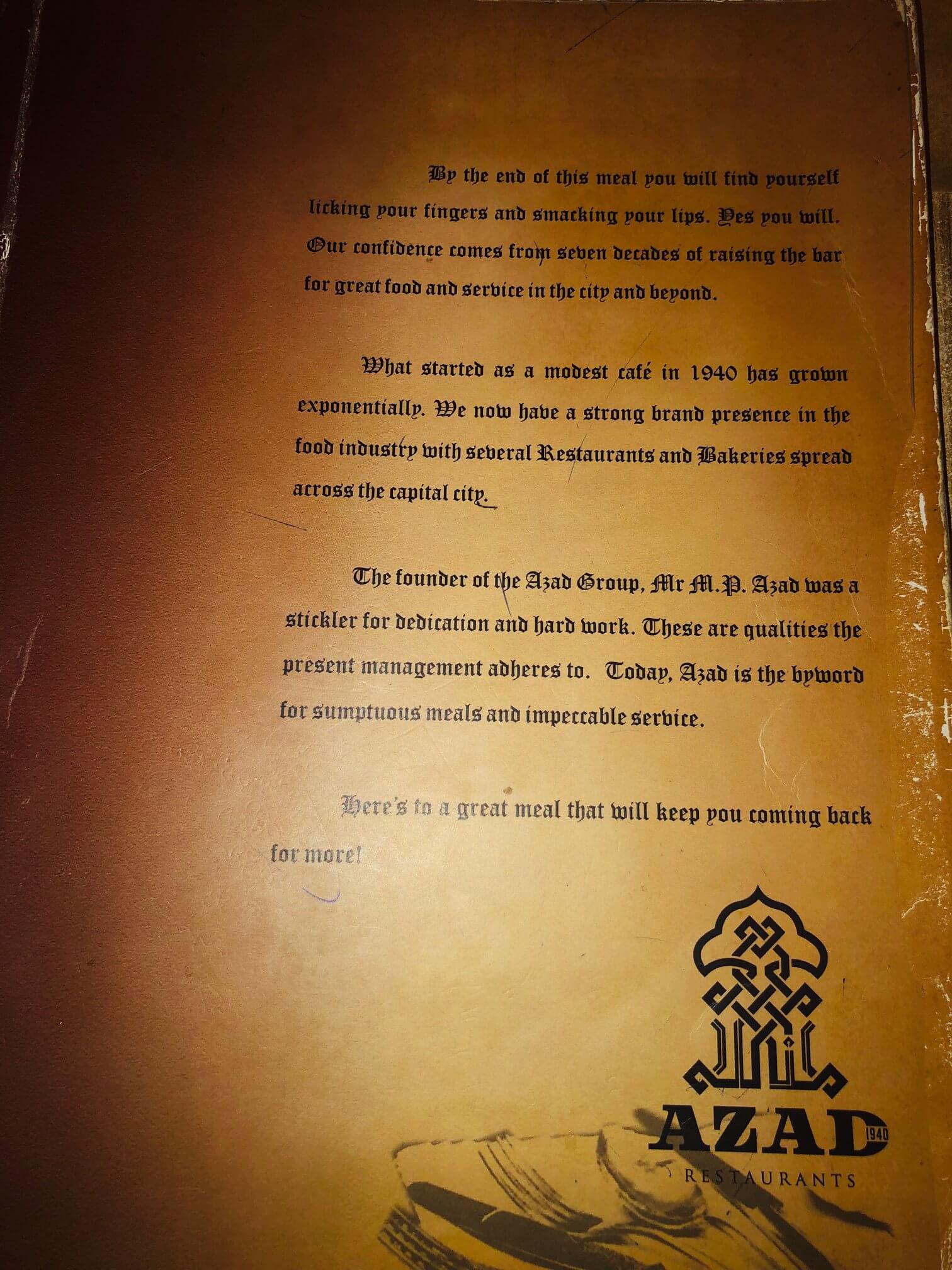 1940 ഇൽ തിരുവനന്തപുരത്തു ഓവർബ്രിഡ്ജിലാണ് ആസാദ് മട്ടൺ വിഭവങ്ങളുമായി തൻ്റെ തുടക്കം അറിയിച്ചത്.